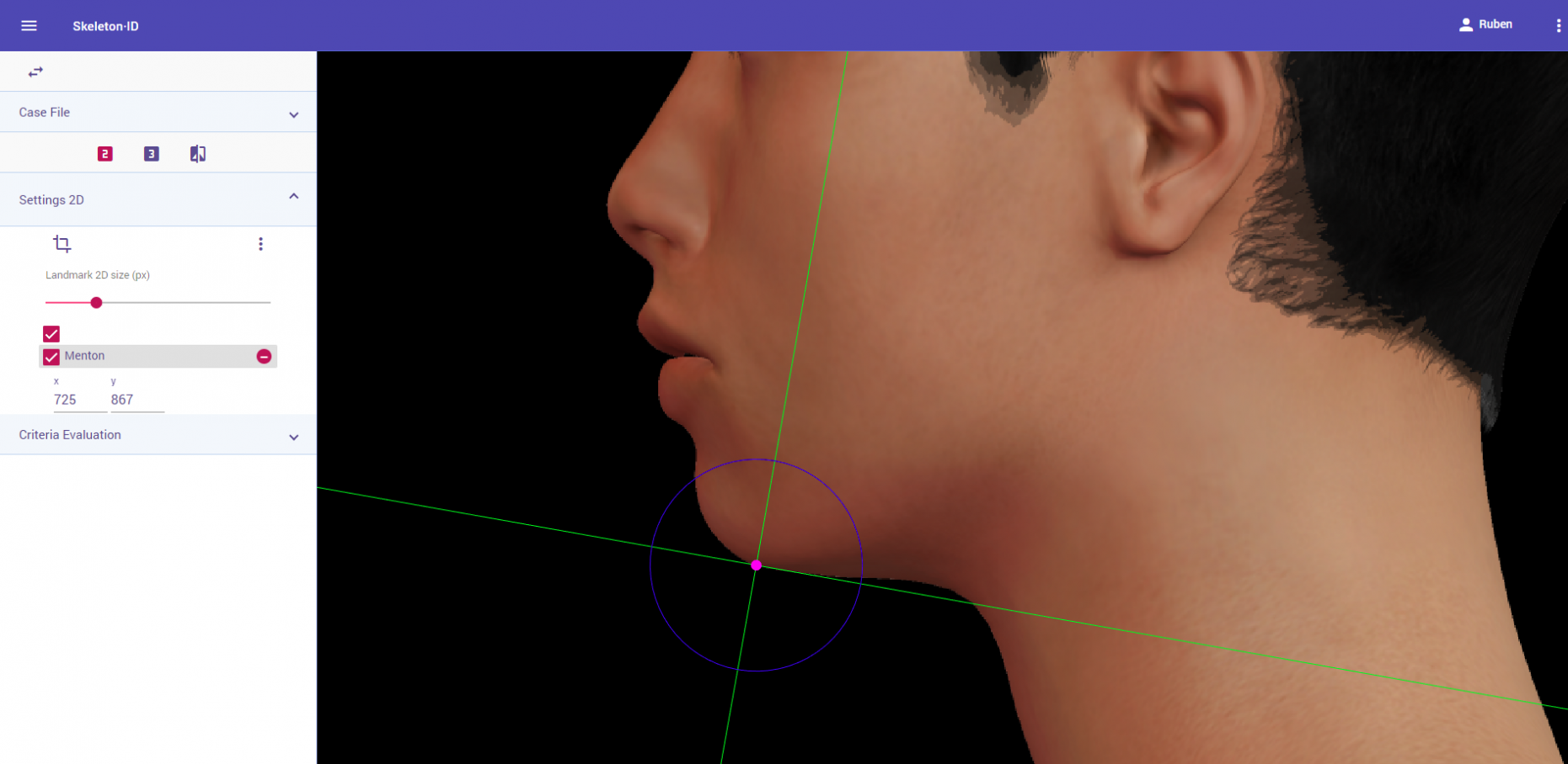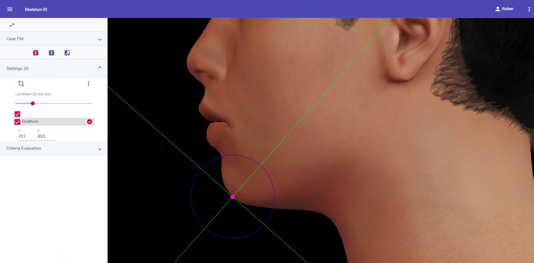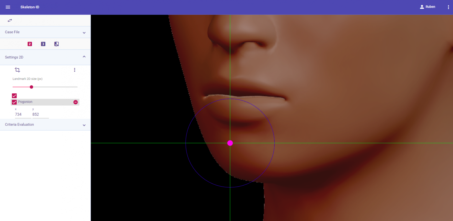 Place pogonion in the most anterior point of the mental protuberance in lateral view. The vertical auxiliary line should be placed in the most anterior point of the curve of the mental protuberance and the horizontal auxiliary line at this height Note that it may be necessary to rotate the auxiliary lines’ axis in order to determine this point.