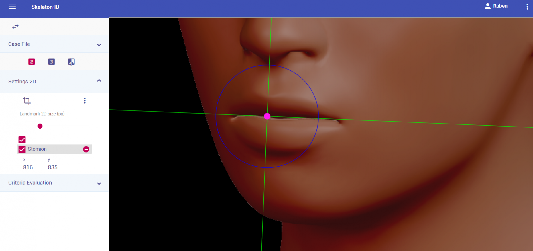 Place stomion on the most anterior point of the labial fissure, where the bodies of the upper and lower lip meet in lateral view. The horizontal line should be placed on the labial fissure, and the vertical line on the most anterior point of the border, where the lips touch.
