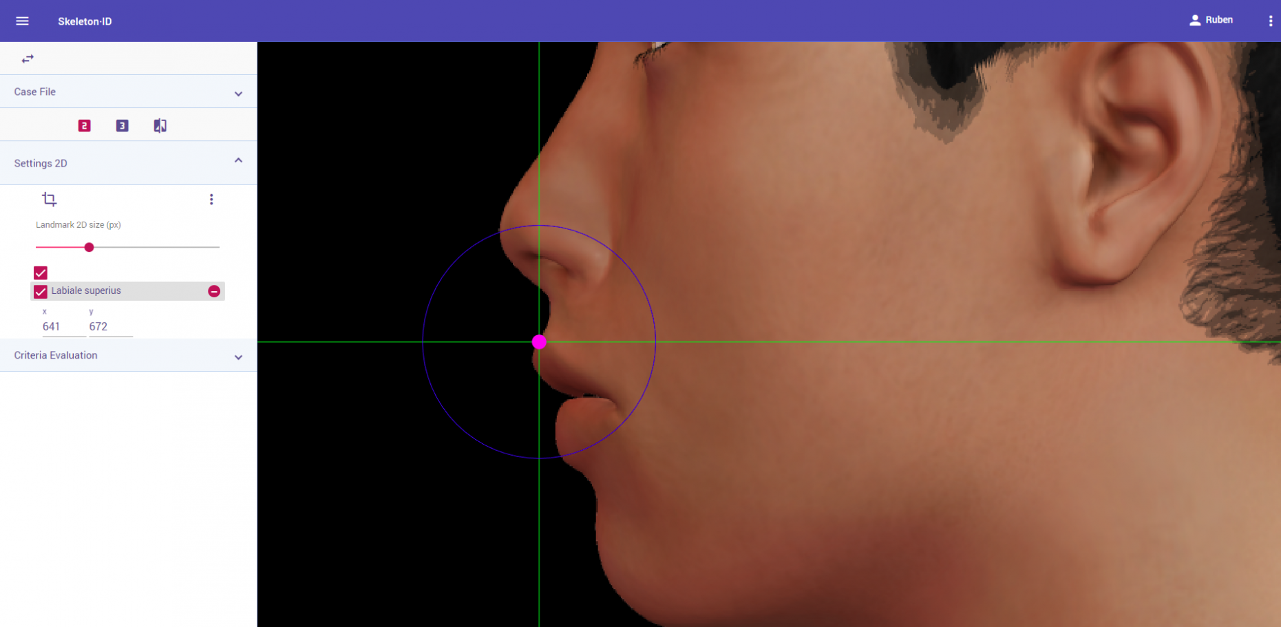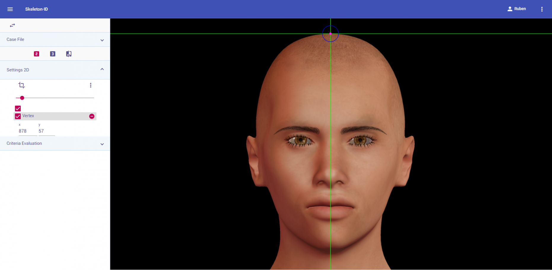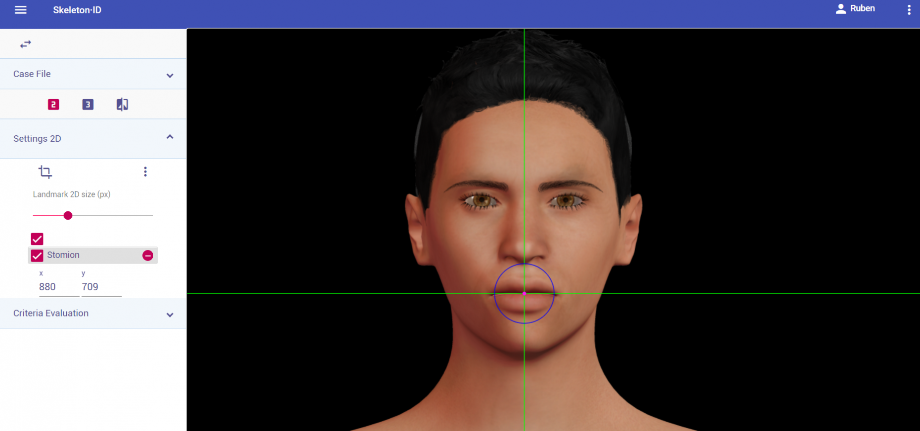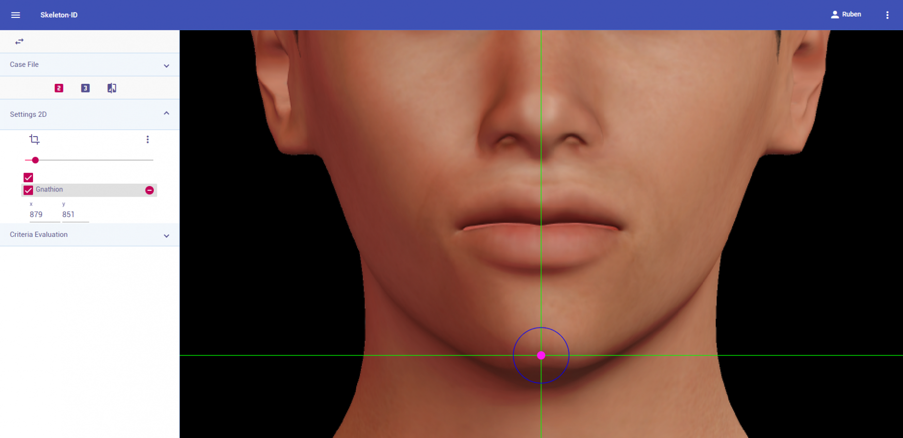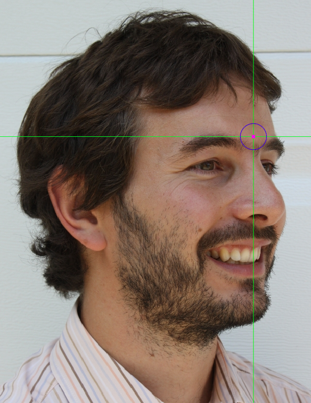Place glabella at the midpoint of the forehead at the level of the brow ridge. Use the vertical and horizontal auxiliary line as reference. The vertical line should be located at the midpoint of the brow ridges and the horizontal line on the upper edge of the eyebrows. Note that it may be necessary to rotate the axis of the auxiliary lines to position the horizontal line on the eyebrows.