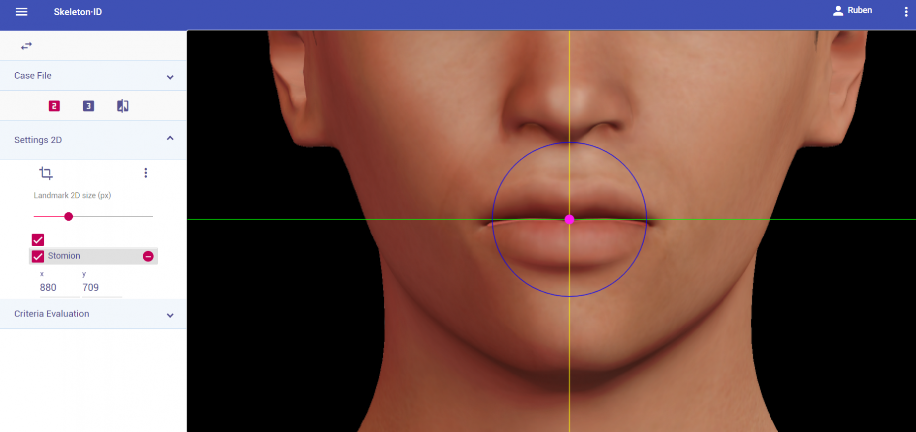 Place stomion on the labial fissure, in the midline point when they are closed naturally in oblique view. The horizontal line should be on the labial fissure, and the vertical line on the midpoint of the lips. Note that it may be necessary to rotate the vertical line in order to mark the labial middle line.