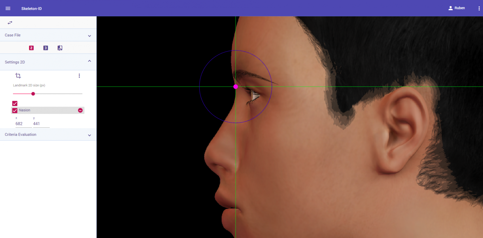 Place nasion over the root of the nose, at the height of the nasofrontal suture in oblique view. The vertical line should be positioned in the medial point between the eyebrows, and the horizontal line should be at the height of the nasofrontal suture (highest point in the nasal bridge).