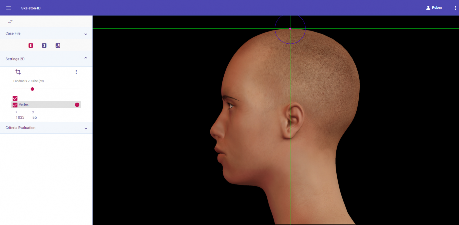 Place vertex on the highest point of the head in lateral view, using the horizontal line as a reference. The horizontal line must be in contact with the uppermost edge of the head contour and the vertical line at the intersection, with the most prominent point.