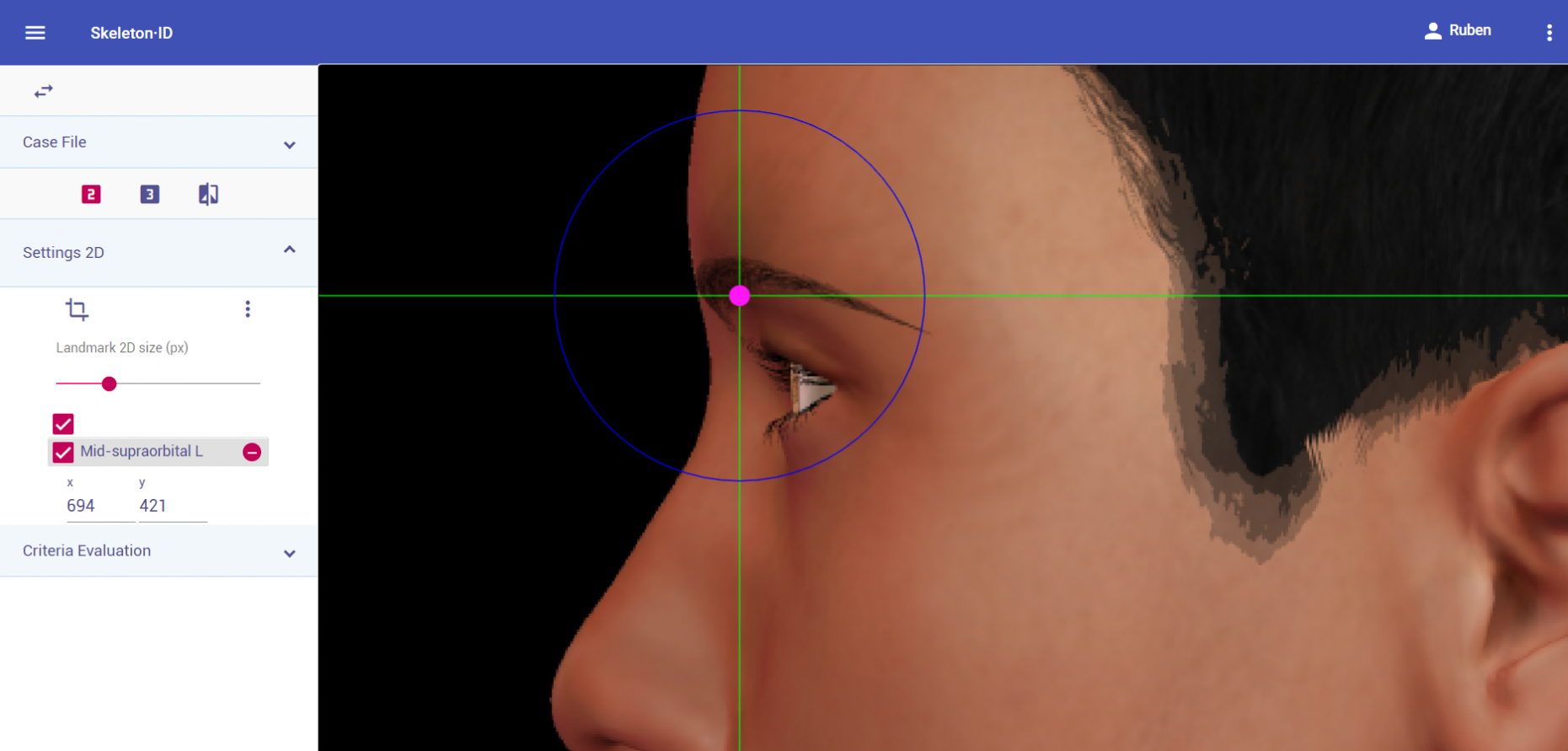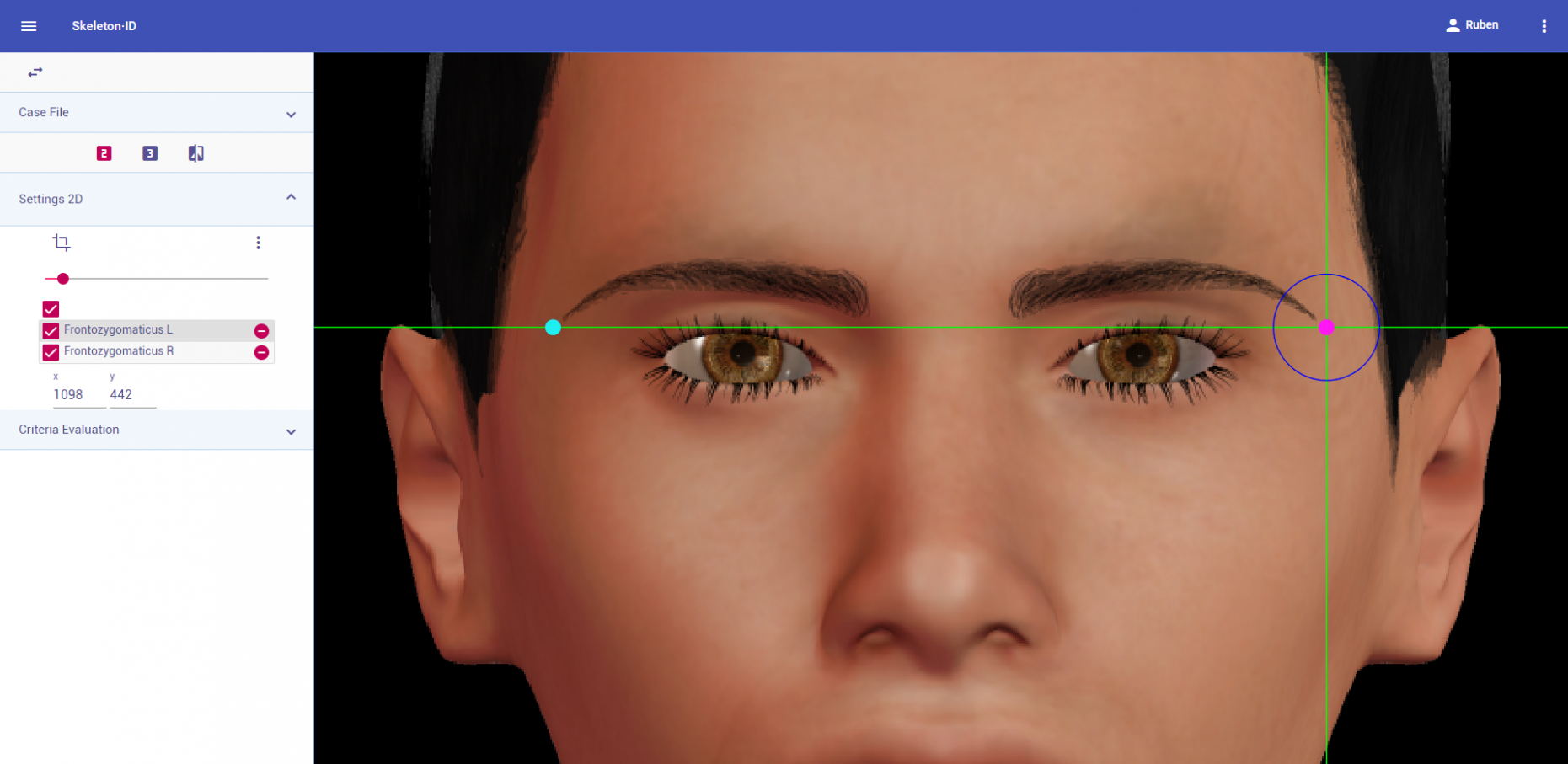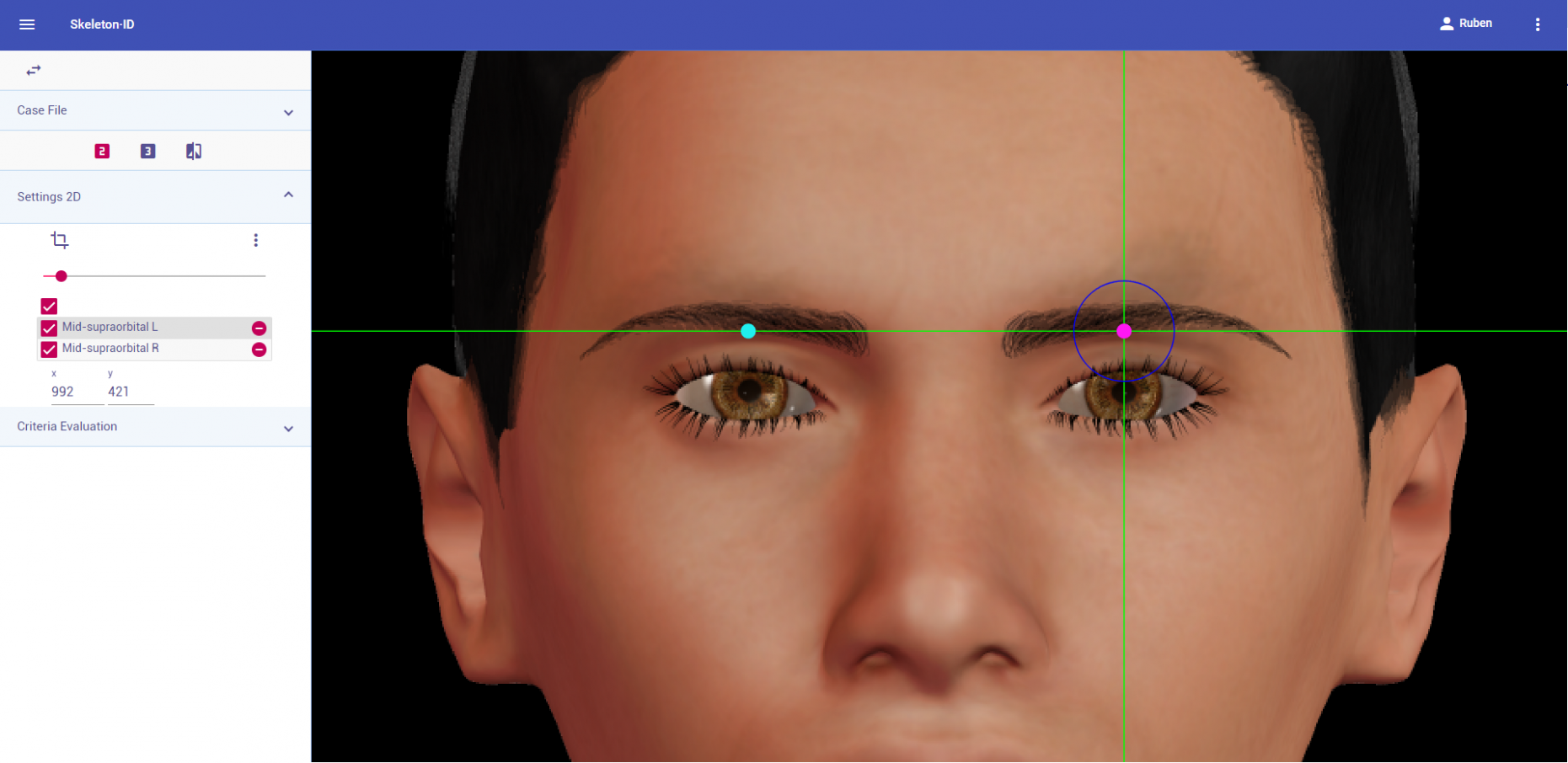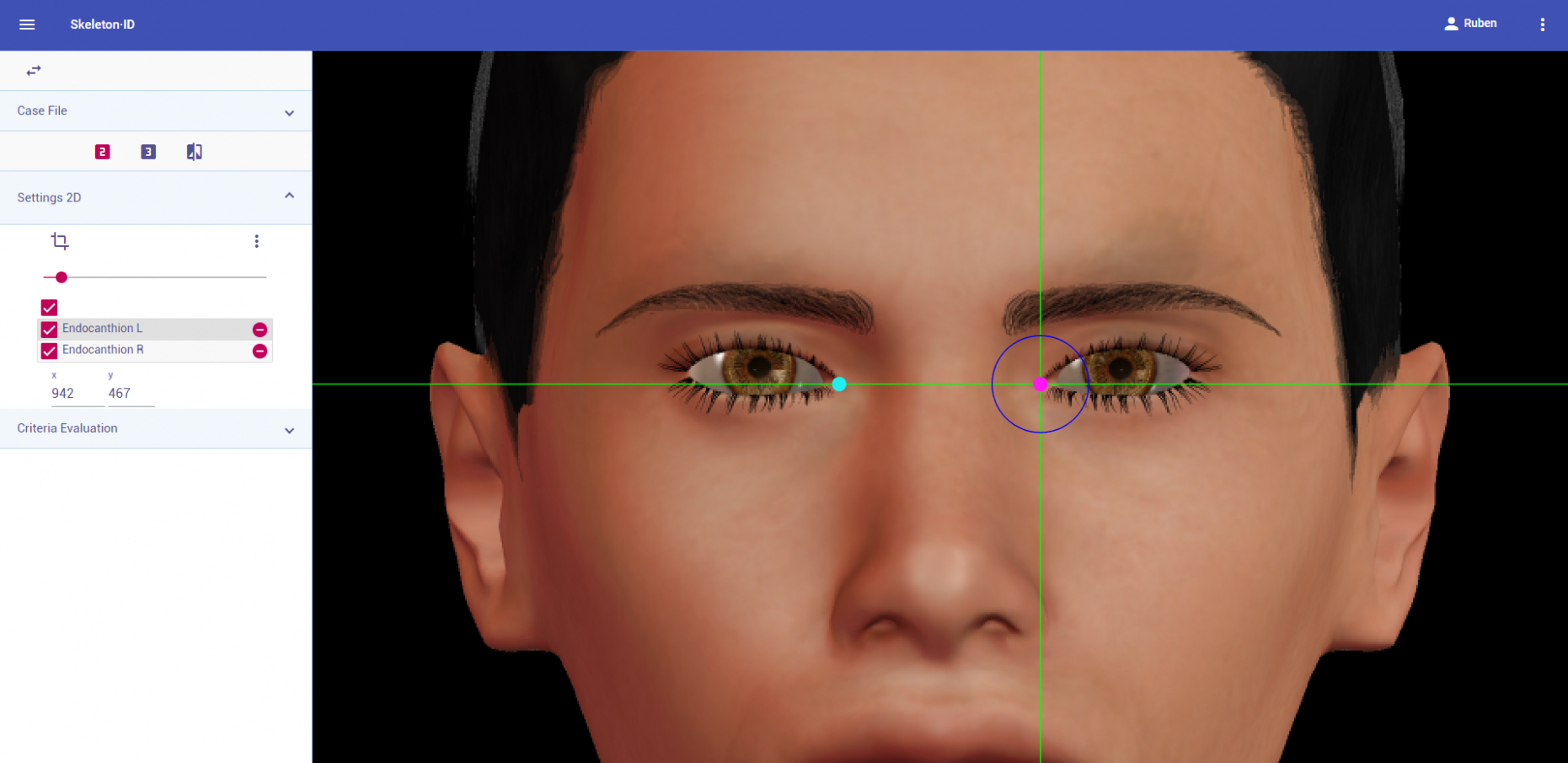 Zoom in on the corresponding eye and place the mouse pointer over the medial canthus where the upper and lower lash lines converge in frontal view. Place the vertical auxiliary line on the medial border of the palpebral fissure and the horizontal auxiliary line where the two lash lines converge. Follow the same procedure for the contralateral landmark.
