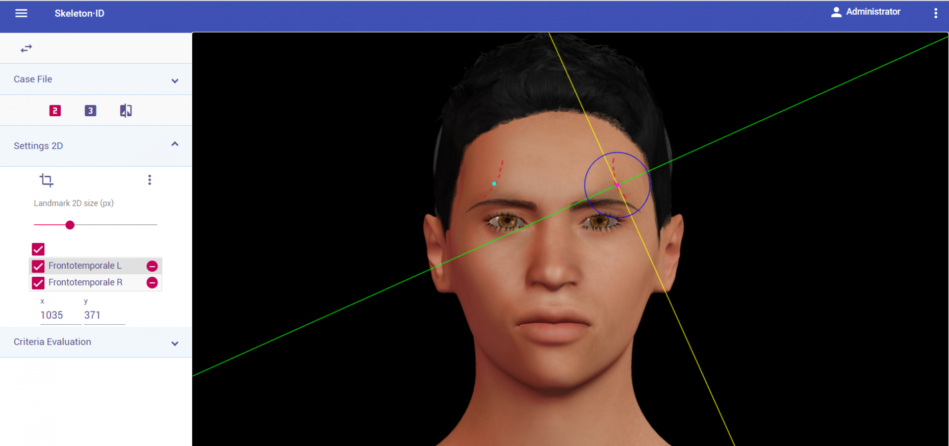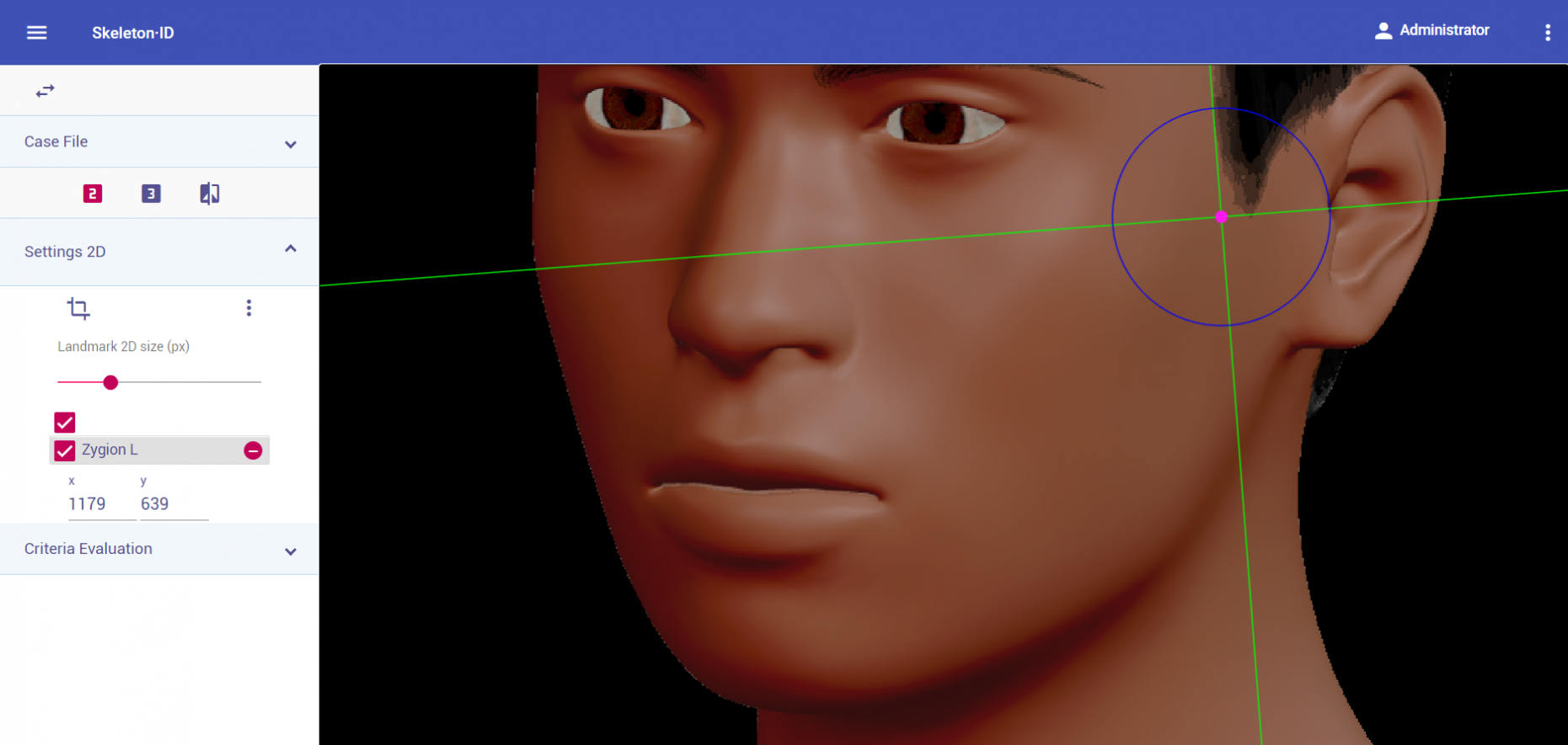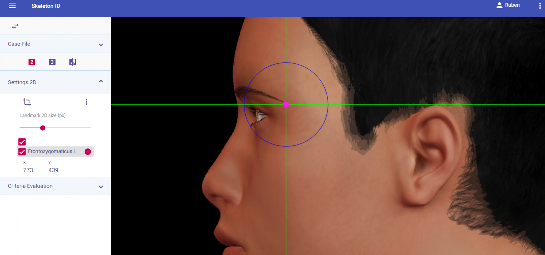Place zygion on the rostral edge of the root of helix and tragus. The vertical auxiliary line should be anterior to the hairline (in the facial skin) and the horizontal auxiliary line should be between the root of helix and the tragus, aligning with the inferior orbital rim. Note that this landmark exhibits high variability in its placement in oblique view images due to the uncertainty associated to its estimation. It may be necessary to rotate the axis of the auxiliary lines in order to place them in the reference area and align them to the inferior orbital rim.