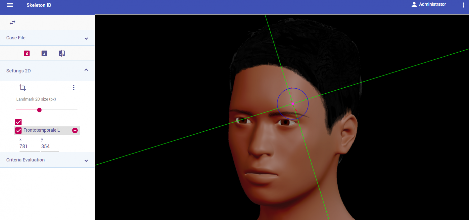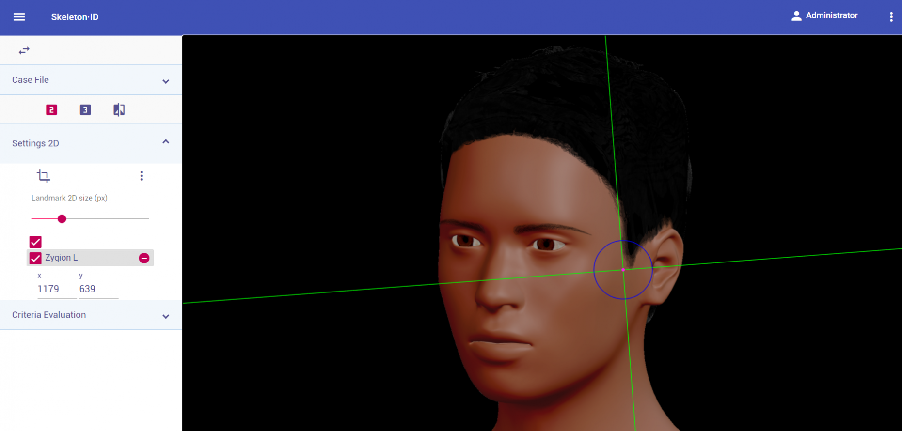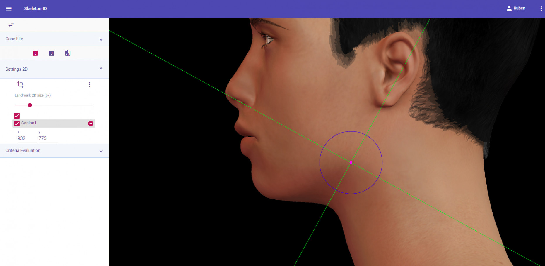 Place zygion on the rostral edge of the root of helix and tragus. The vertical auxiliary line should be anterior to the hairline (in the facial skin) and the horizontal auxiliary line should be between the root of helix and the tragus, aligning with the inferior orbital rim. Note that this landmark exhibits high variability in its placement in oblique view images due to the uncertainty associated to its estimation. It may be necessary to rotate the axis of the auxiliary lines in order to place them in the reference area and align them to the inferior orbital rim.