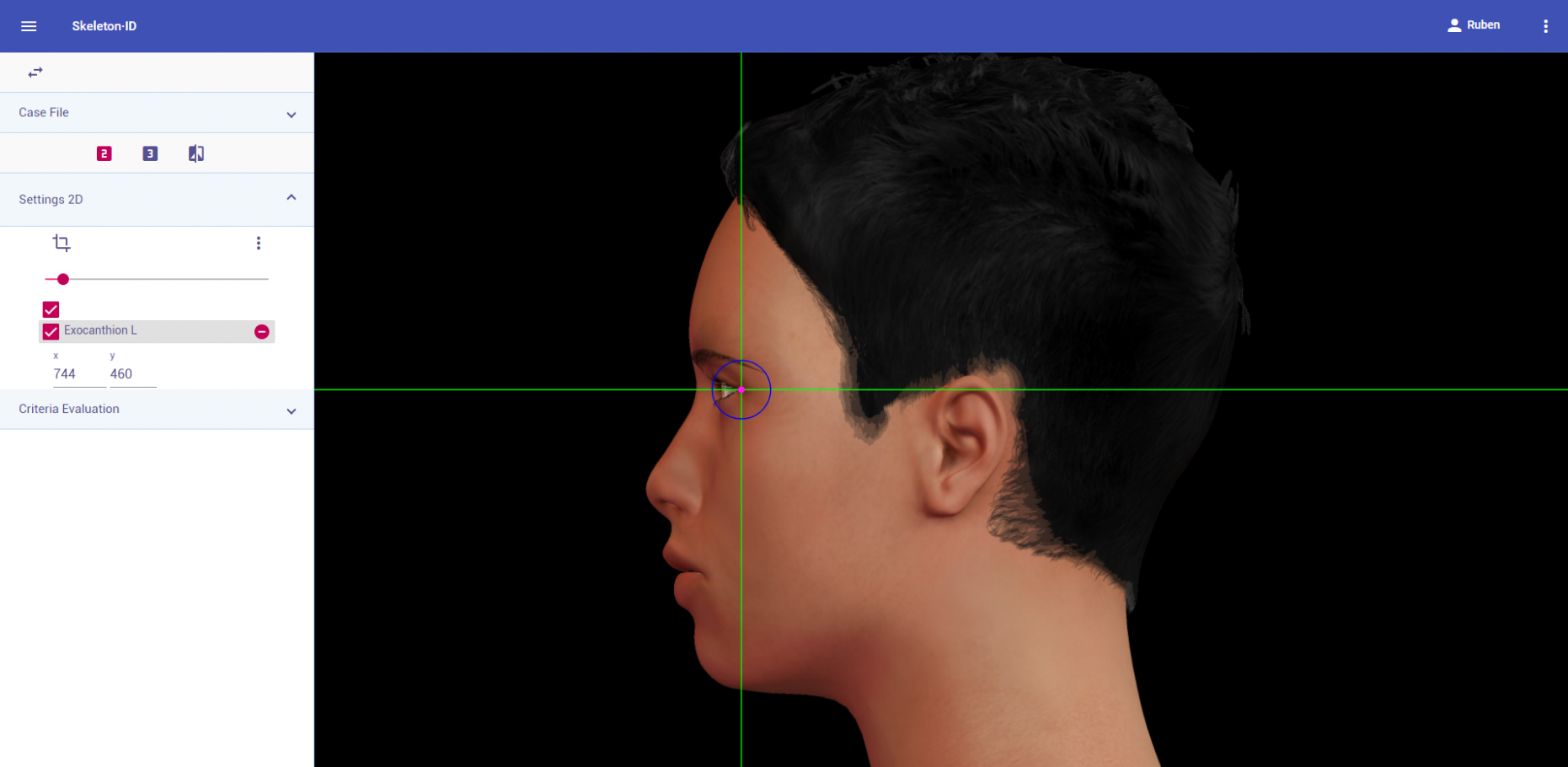 Zoom in on the corresponding eye and place the mouse pointer over the lateral canthus where the upper and lower lashlines converge in frontal view. Place the vertical auxiliary line on the lateral edge of the palpebral fissure and the horizontal auxiliary line where the two lashlines converge. Note that the rotation of the head in oblique view might hinder the location of the lateral canthus of one of the eyes.