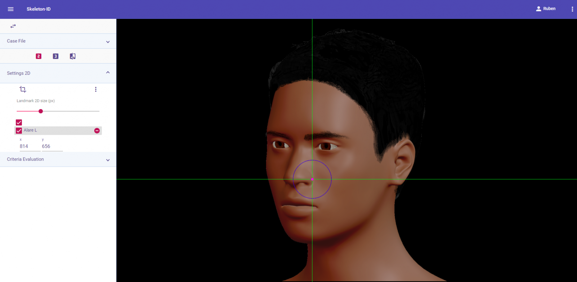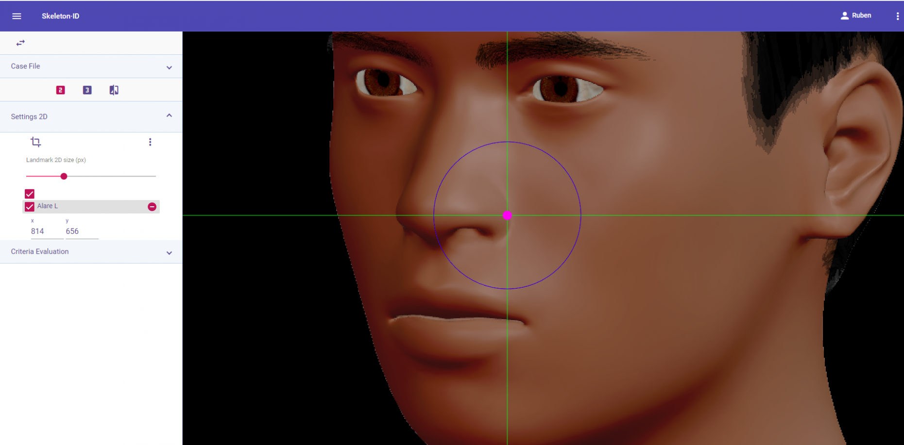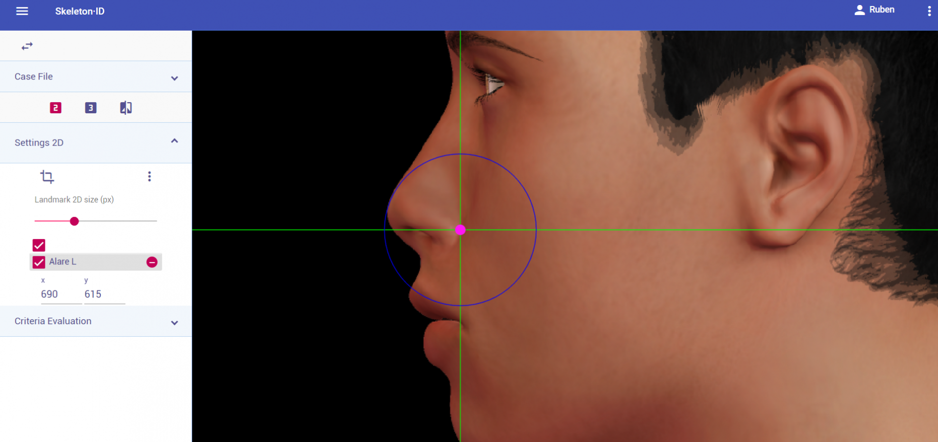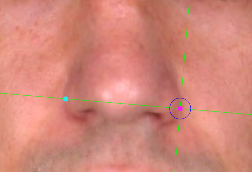 Place alare on the most lateral point of the nasal alae in frontal view. The vertical auxiliary line should be placed on the most lateral point of the nasal ala (it may be necessary to rotate the axis of the auxiliary lines to determine this point), and the horizontal auxiliary line should be placed on the maximum width of the nasal alae. Follow the same procedure for the contralateral landmark, which may not be at the same height, which means it may be necessary to rotate the horizontal line to find the most accurate alignment.