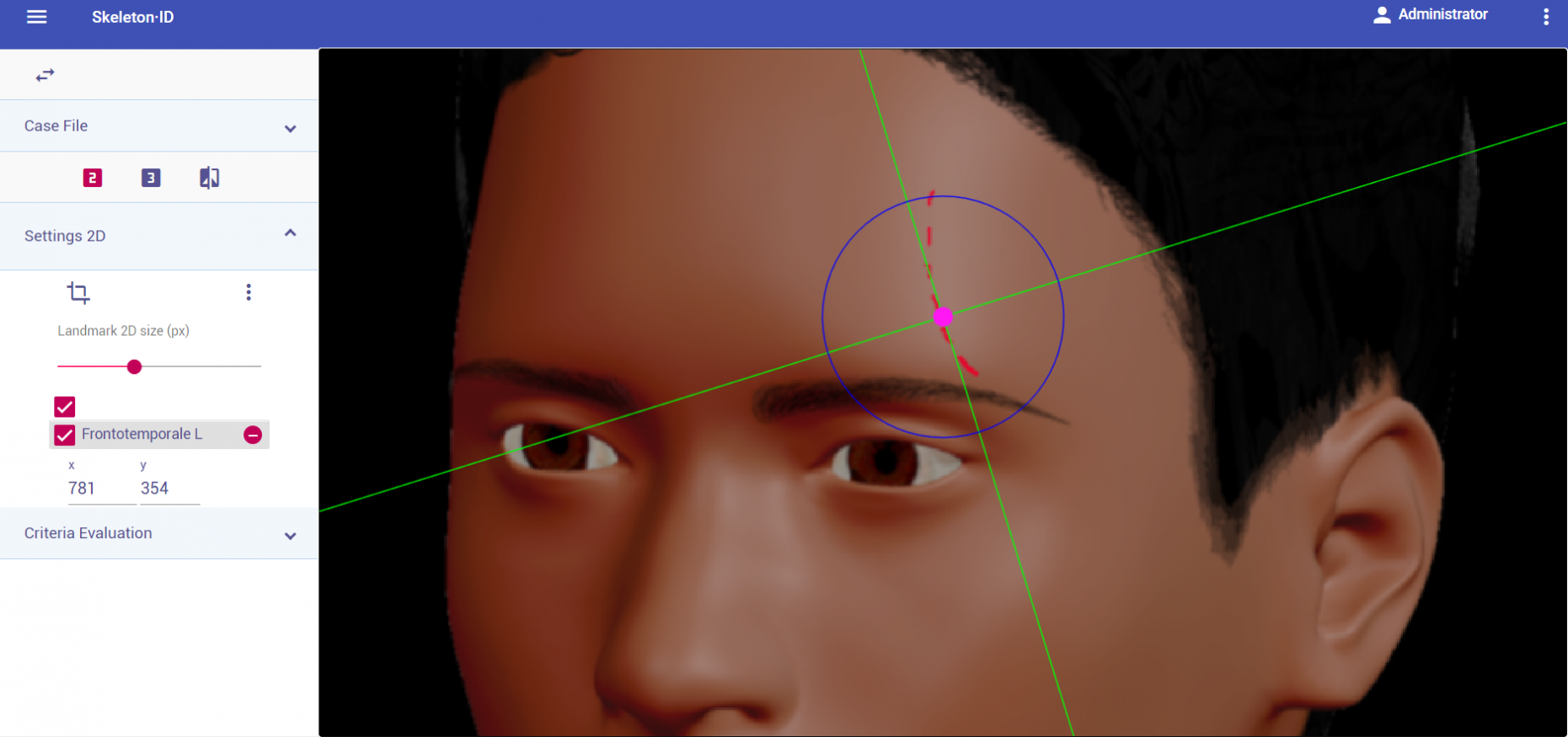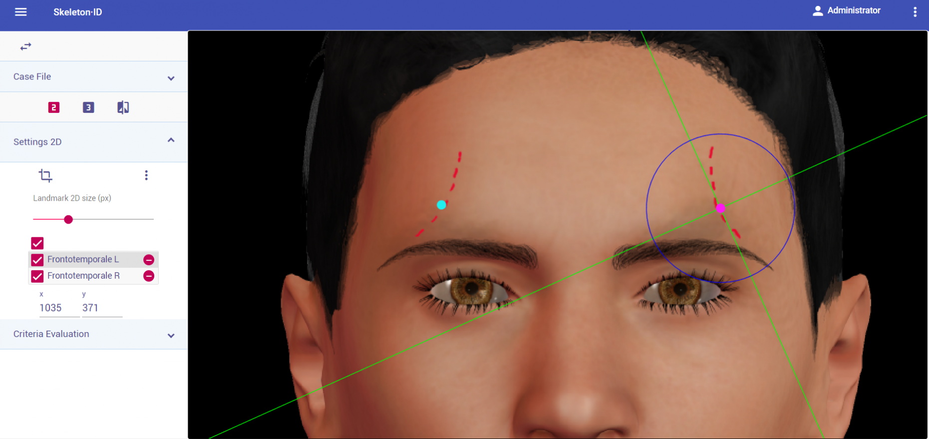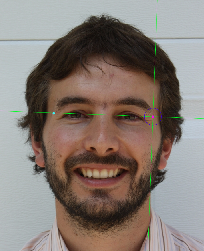 Zoom in on the corresponding eye and place the mouse pointer over the lateral canthus where the upper and lower lash lines converge in frontal view. Place the vertical auxiliary line on the lateral edge of the palpebral fissure and the horizontal auxiliary line where the two lash lines converge. Follow the same procedure for the contralateral landmark.