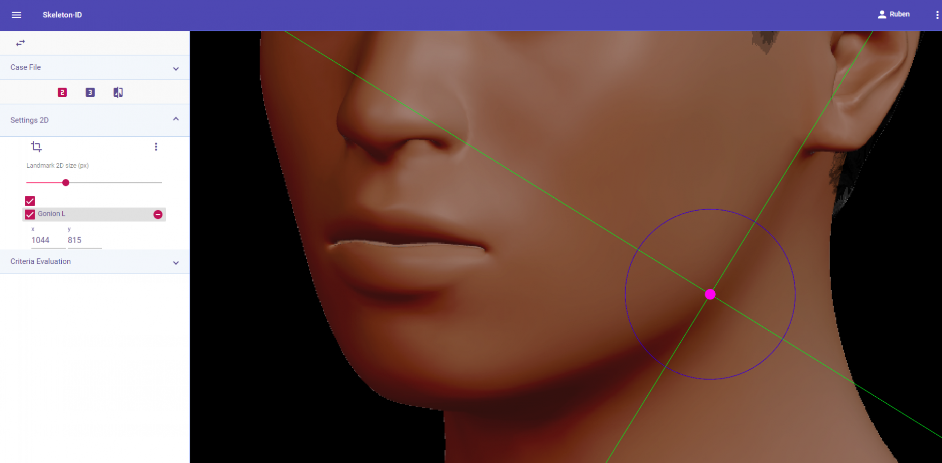 Place gonion on the mandibular angle in frontal view. Place the horizontal auxiliary line over the lower lip and the vertical auxiliary line on the edge of the lateral contour of the mandible. Follow the same procedure for the contralateral landmark. It can be challenging to accurately locate this landmark due to the fact that it is usually located through palpation (Type 3) on the mandibular angle, and has to be estimated on photographs.