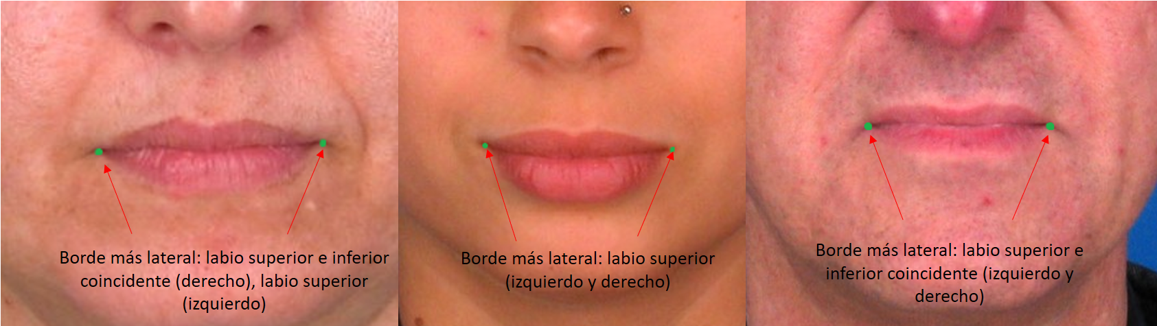 Standardized definition (Caple y Stephan, 2015): Outer corners of the mouth where the outer edges of the upper and lower vermillions meet.